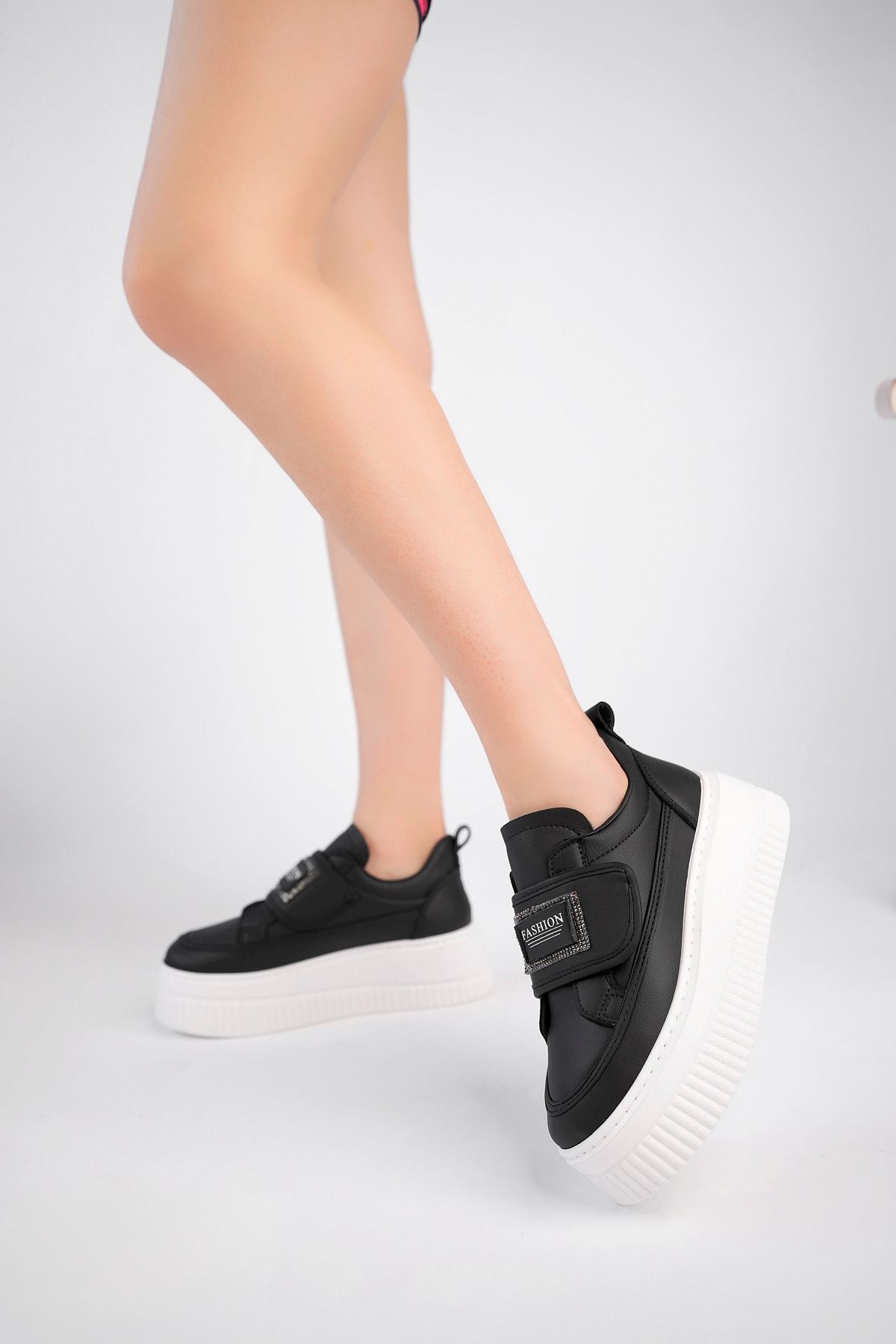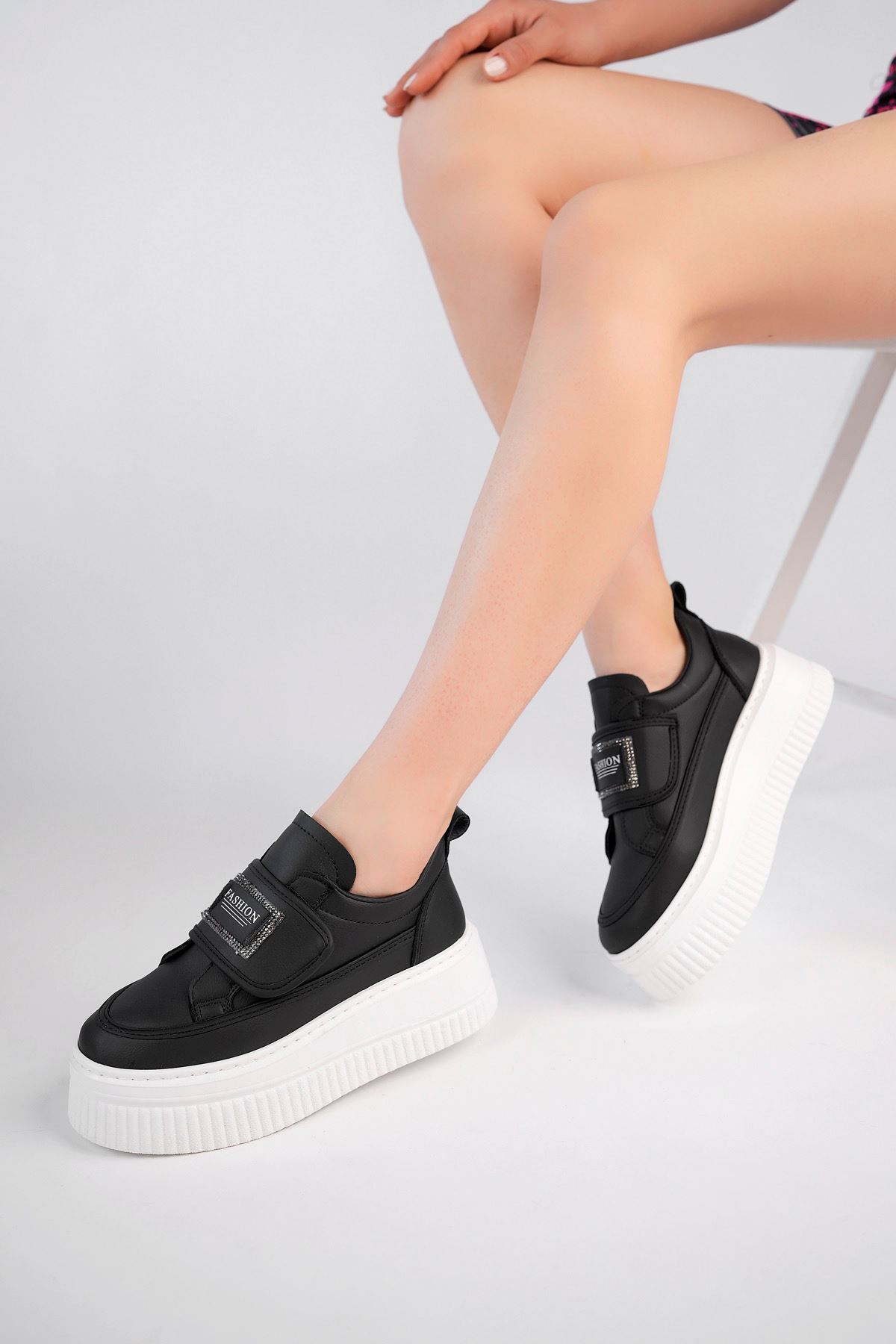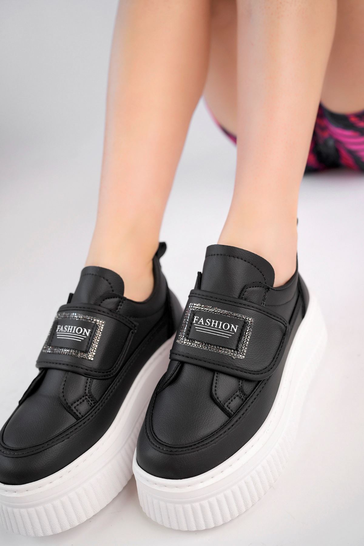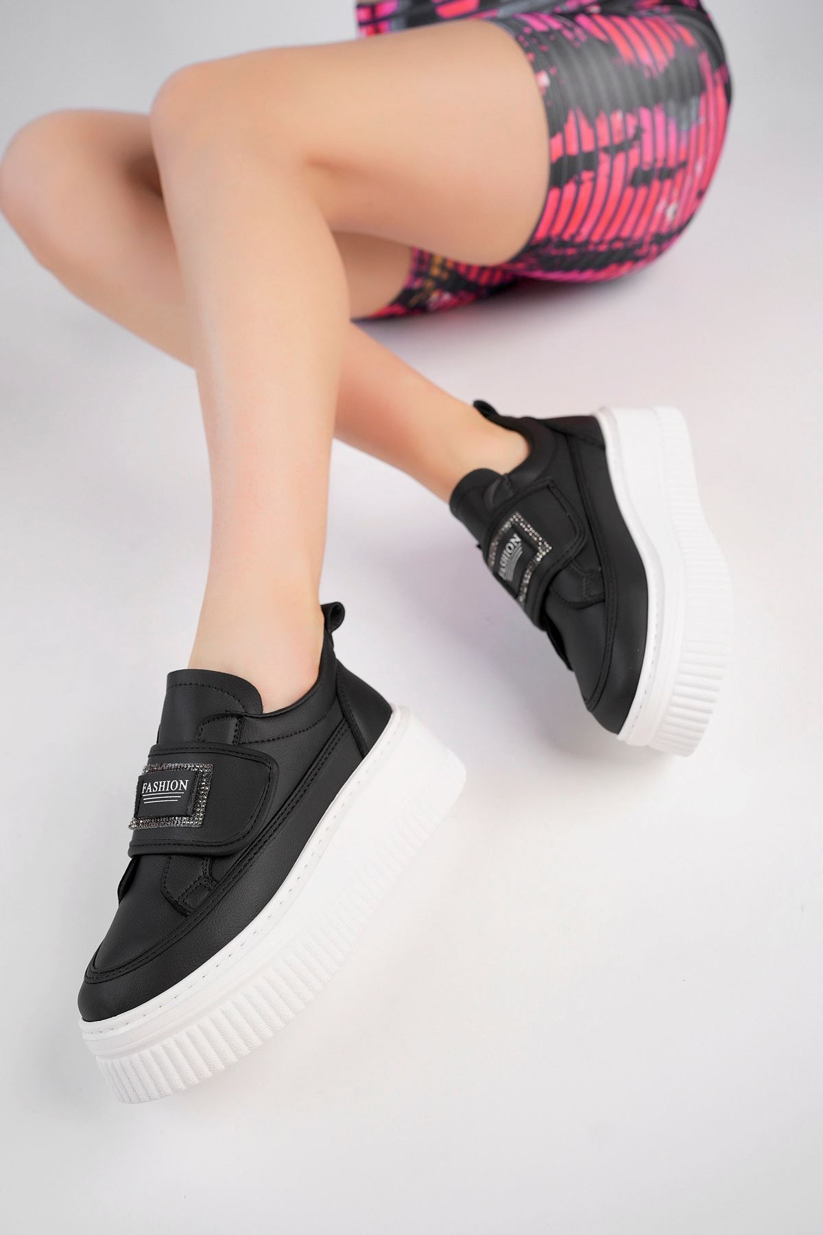 Dolgu Topuk Cırtlı Siyah Ayakkabı