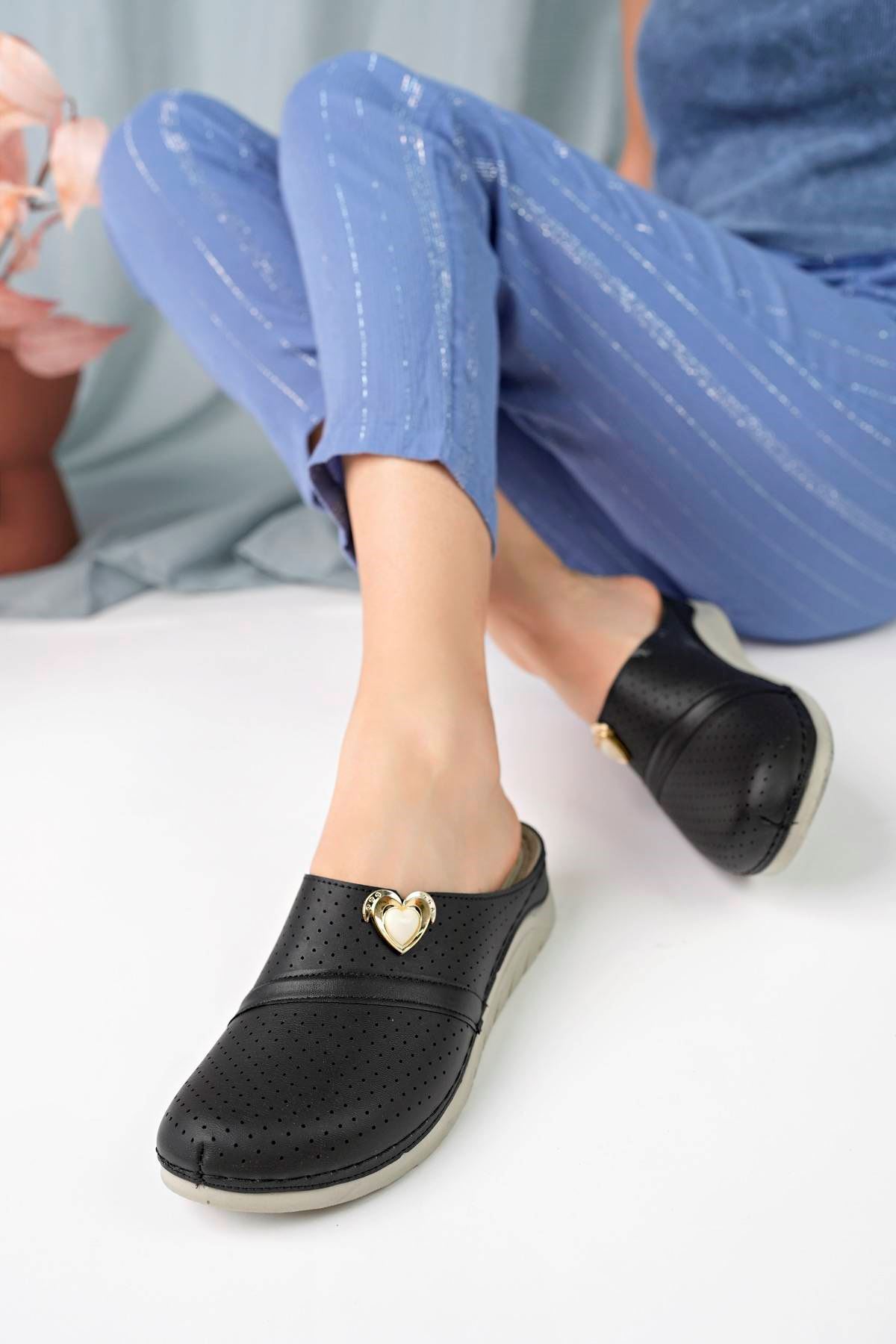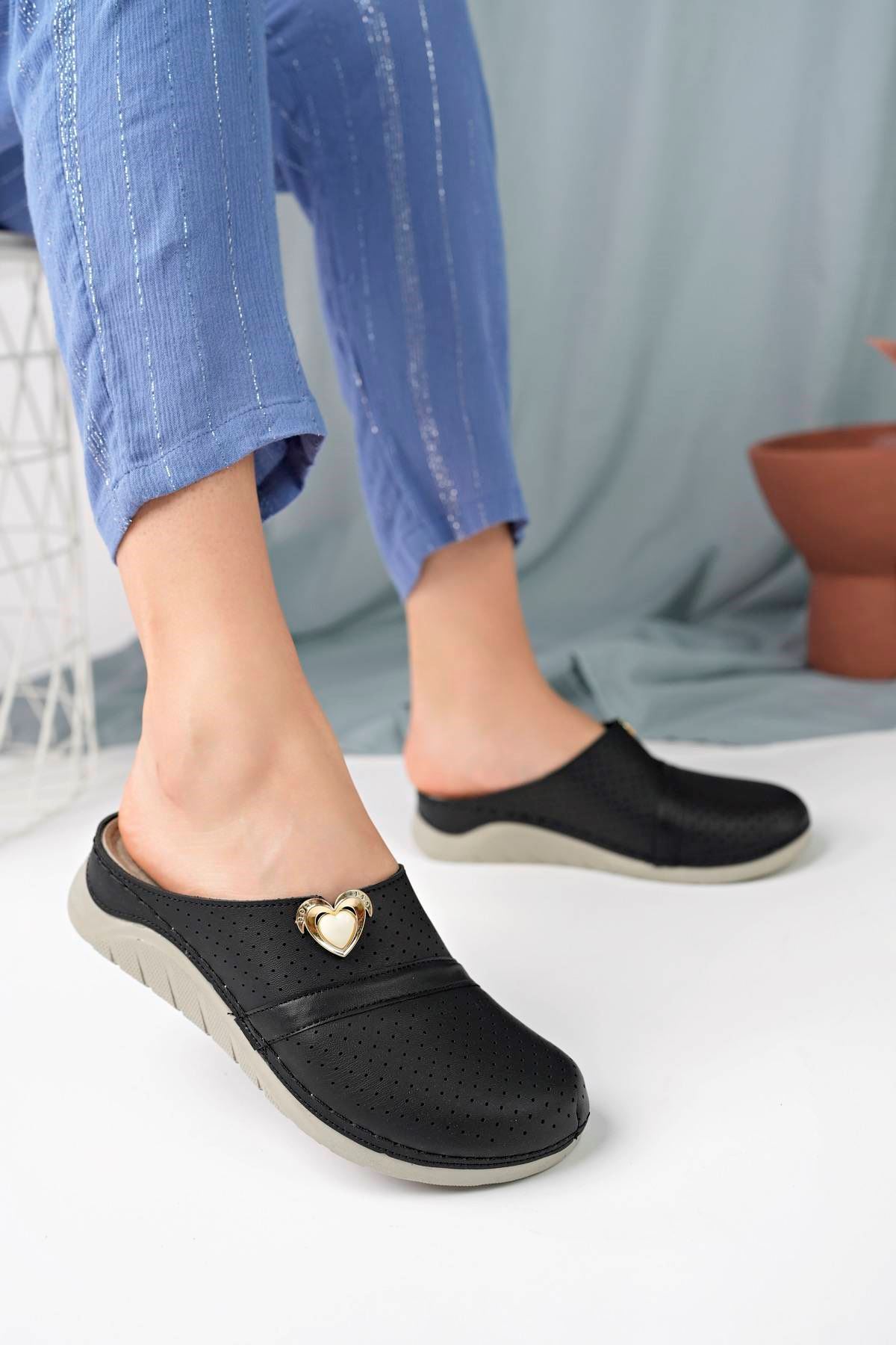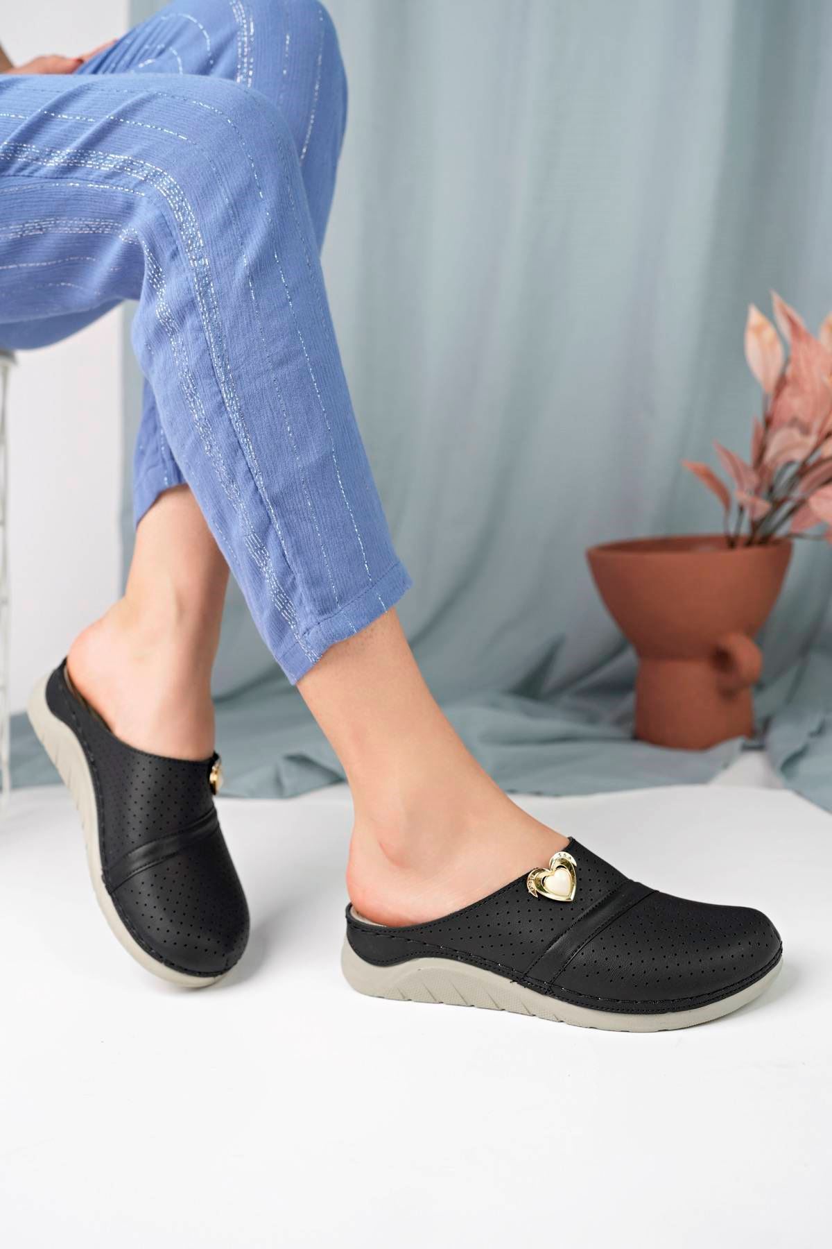 Ortapedik Taban Kalp Taşlı Siyah Kadın Terlik